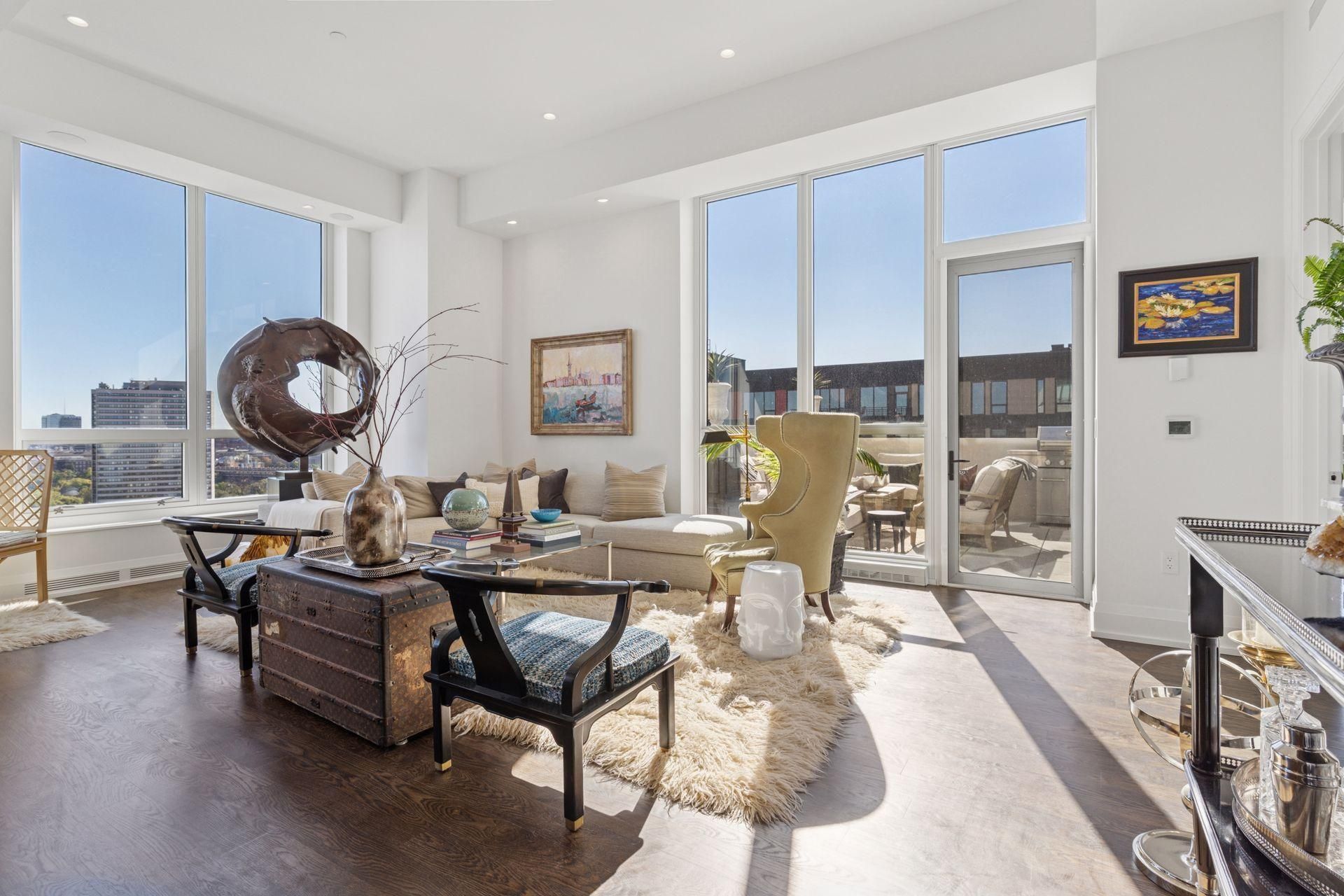 Discover breathtaking views from this truly spectacular corner condominium on the 15th floor of the prestigious Robert A.M. Stern Architects' Eleven building. Set on the Mississippi Riverfront in the desirable Mill District, this exceptional home was designed to the last detail for sophisticated and comfortable living. Find a bright and open floorplan with raised ceilings and walls of windows to drench the space in natural light. Thoughtful, custom touches to enhance your lifestyle include elegant Carrara marble, hardwood floors, Sonos surround sound, Opti-myst fireplace, Lutron lighting, fully automated blinds, and racetrack ceiling embellishments. The crowning jewel is the large, private open-air deck overlooking the city. This home is one of only six units in the building to have such a luxury!The gracious foyer welcomes you with racetrack ceiling trim, and leads into the main living space. Feel on top of the world in the living room surrounded by walls of glass providing panoramic views of the city. Create intimate conversation areas where you can sit quietly with your guests, or host large, festive holiday celebrations here with the city as an exciting backdrop to your gatherings. The chef's dream kitchen is adjacent, featuring an expansive island to join the areas. The kitchen boasts top-of-the-line appliances, visual comfort pendant lighting, Carrara marble backsplashes, and abundant cabinetry with roll-out drawers. The breakfast bar provides additional seating for your guests, or can be used as a comfortable place to sip your morning coffee. The lavish owner's suite will be your private retreat, complete with a corner bedroom with two sides of windows, a vast walk-in closet with built-ins, LED lighting and Carrara marble counter. The luxurious owner's bath features an expansive vanity with dual sinks, Carrara marble backsplashes and heated flooring, and fashionable lighting. A second bedroom can easily function as a den or study to accommodate the changing needs of your household. This space is accented with a stunning bay window, a 40 inch Opti-myst fireplace and floating shelving. A sliding barn door adds privacy and visual interest. Steps away is a three-quarter bath with Carrara marble and attractive lighting. The sparkling in-unit laundry room offers a stacking washer/dryer, a sink, sleek white JW Woodcraft cabinetry, and a bonus desk for a home office or computer workspace.The incredible open-air patio will be a relaxing escape from the daily chores, or would be ideal as a wonderful place to host outdoor parties. Imagine catching a few rays of sun on a summer day while reading a good book, or sitting with a beverage at night under the stars! Association amenities include a rooftop pool and terrace, a business center, community room, recreation room, guest suite, sauna and exercise room. Close to Gold Medal Park, the Stone Arch Bridge, and cultural venues like The Guthrie, the location in downtown Minneapolis is world-class!