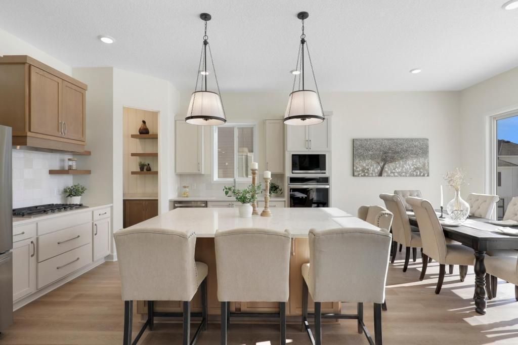 Welcome to Radisson Hills, an exclusive community located in the highly desirable city of Blaine. Proudly introducing 'The James - a masterfully crafted home by local custom builder NR Properties. This home goes beyond standard - crafted with elevated quality and a custom approach from start to finish. Every inch reflects thoughtful design and elevated finishes, hand-selected by NR's in-house design team. The show-stopping kitchen features luxurious Quartz countertops, custom cabinetry, sleek LG appliances, open shelving, and an oversized island with bar seating. The oversized walk-in pantry is an unexpected surprise, adding style to the space while amplifying storage. Step into the owner's suite through elegant French doors, perfectly framed by designer sconce lighting. Inside, a walk-in closet with organization that's as functional as it is fabulous. Ope. Not you mistaking your own bathroom for a spa. The space feels like it's straight out of a spa catalog, truly! Downstairs is a dream! Whether hosting game night or binging a cozy movie marathon, this lower level delivers. The spacious open concept living area offers flexibility for lounging, gaming, or entertaining, while a non-conforming room provides the perfect nook for a home office, or creative space. The custom bar is a true showpiece, featuring Quartz countertops, statement wallpaper backsplash, under-cabinet lighting, and dedicated wine storage that makes for a grape spot to display your favorite bottle. Step outside to enjoy yard games and soak in beautiful pond views from your private walk-out patio. The curb appeal is absolutely striking. The exterior showcases LP siding paired with eye-catching accents at the entry, framing in a stunning statement door. Expansive Andersen Bronze windows and 8-foot sliding glass doors flood the home with sunlight throughout the day. As for location - Blaine is bursting with lifestyle perks. From scenic trails, beaches, and championship golf to the renowned National Sports Center, there's something for everyone. Coming soon: 'Downtown Blaine, a vibrant new development featuring pickleball courts, mini golf, breweries, restaurants, and top-tier shopping. There truly is no place quite like this home, or this city. Welcome to life at The James, where luxury living meets a fun, easy lifestyle in all the best ways. Currently under construction. Estimated completion for October. Photos are of a previously built model.