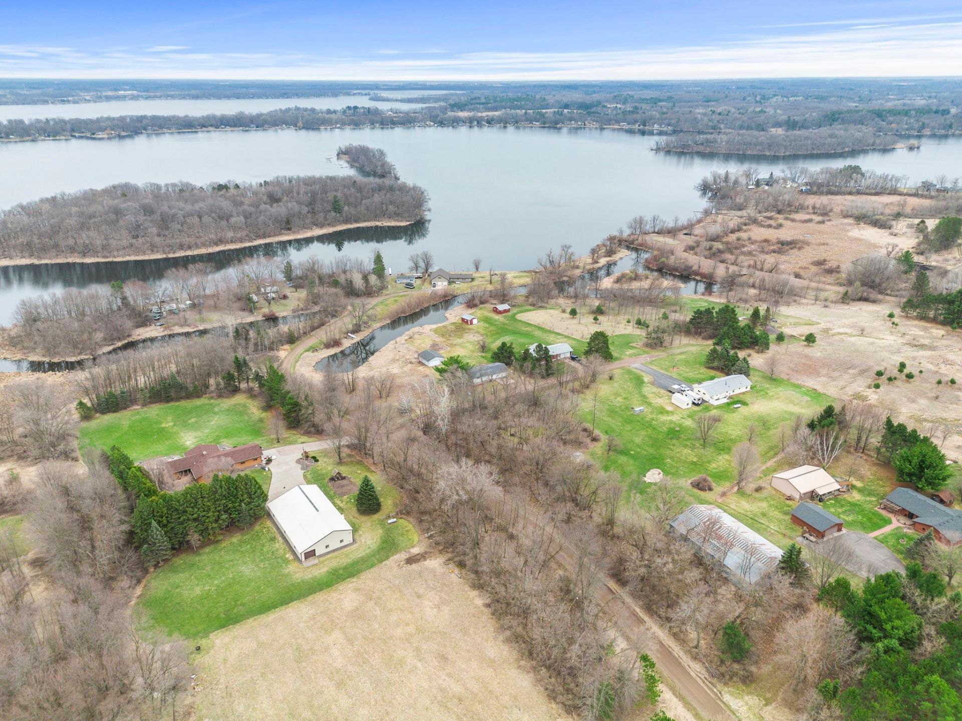 Enjoy this year-round home that has a beautiful view of West Rush Lake from the deck. Located on a cul-de-sac, this home has channel access to the lake. The home has a primary bedroom on the main level with an attached full bath. The kitchen is large with a spacious eat-in area. The upper level has a beautiful knotty pine ceiling and leads out to the deck, offering a view of the large backyard and the lake. Spiral stairs lead you downstairs to a large family room with a double-sided fireplace, wood burning on one side and gas on the other side. The second bedroom downstairs also has an attached full bath. Sliding doors lead out to your patio. The tuck-under garage is also accessed from the lower level. A great place to store lawn equipment, toys, and your canoe or kayak! Also included with this great property is a large, oversized two-car garage with a concrete floor that is close to the shoreline. Use your imagination on this one! A great man cave, she shed, whatever! It's just waiting for your ideas. New furnace and a/c installed in 2024. Public access to the lake is one street south of the property.