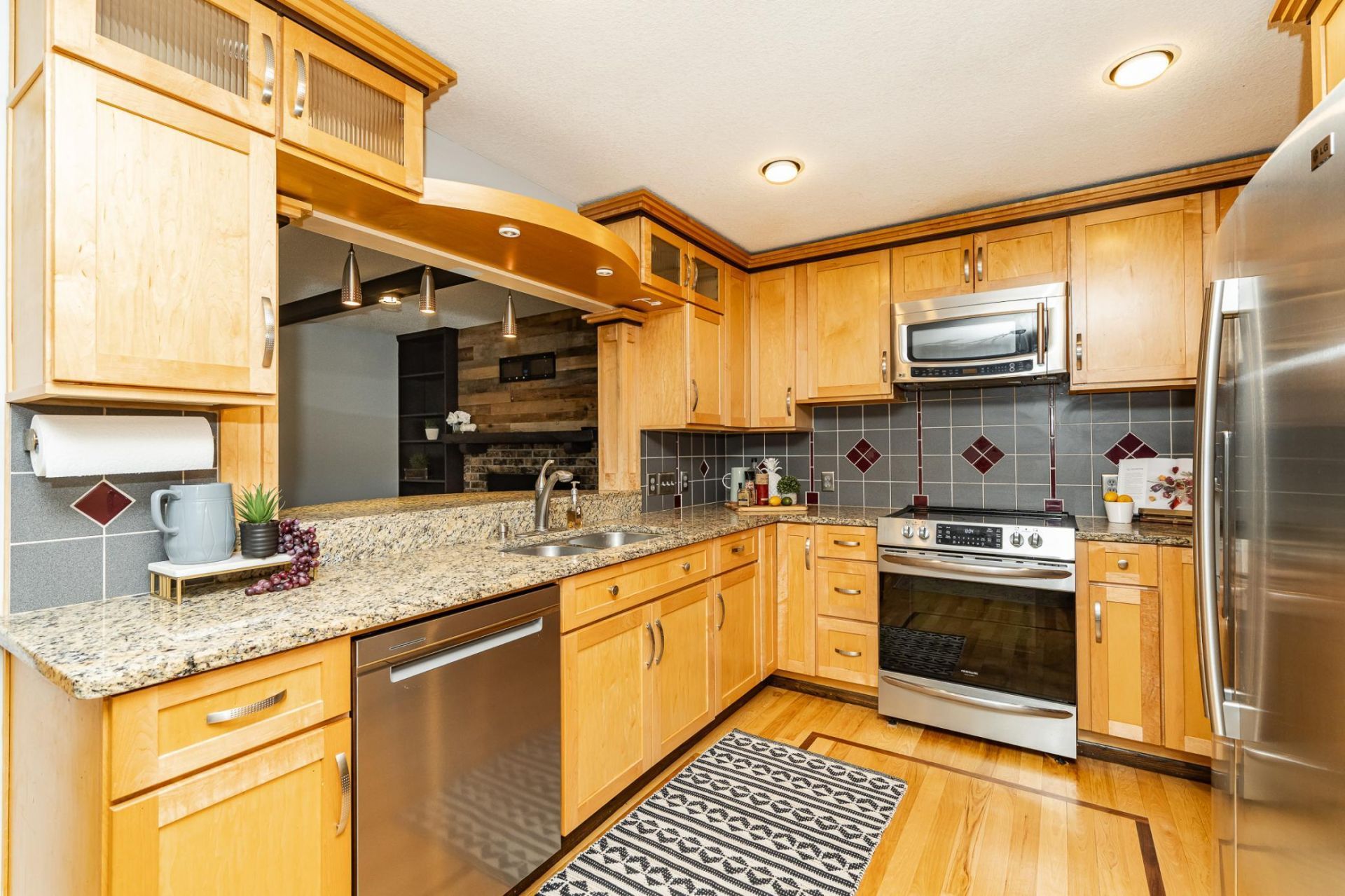 Set on a corner lot in Elton Hills just one block from the neighborhood park and nearby walking paths, this home offers the kind of layout that gives everyone space to spread out and come together. With three separate living areas, including two on the upper level and a spacious lower level family room, there's room for movie nights, play space, work from home, or simply having more than one place to unwind. The upper level includes three bedrooms and a 3/4 bath with a nicely sized tiled shower and glass door enclosure, while the lower level adds a fourth bedroom with lookout windows and an additional 3/4 bath for flexibility. The custom kitchen sits in the heart of the home with maple cabinetry, granite countertops, newer stainless appliances, and hardwood flooring with a cherry inlay detail, and the back living room offers a cozy gas fireplace and views of the fully fenced backyard. New carpet throughout and fresh paint on the upper level and stairway give the home a clean, move in ready feel. Outside, the fully fenced backyard offers space to relax or gather with a composite deck, paver patio, and storage shed, along with a two car tuckunder garage and an EV charger that will stay with the home.